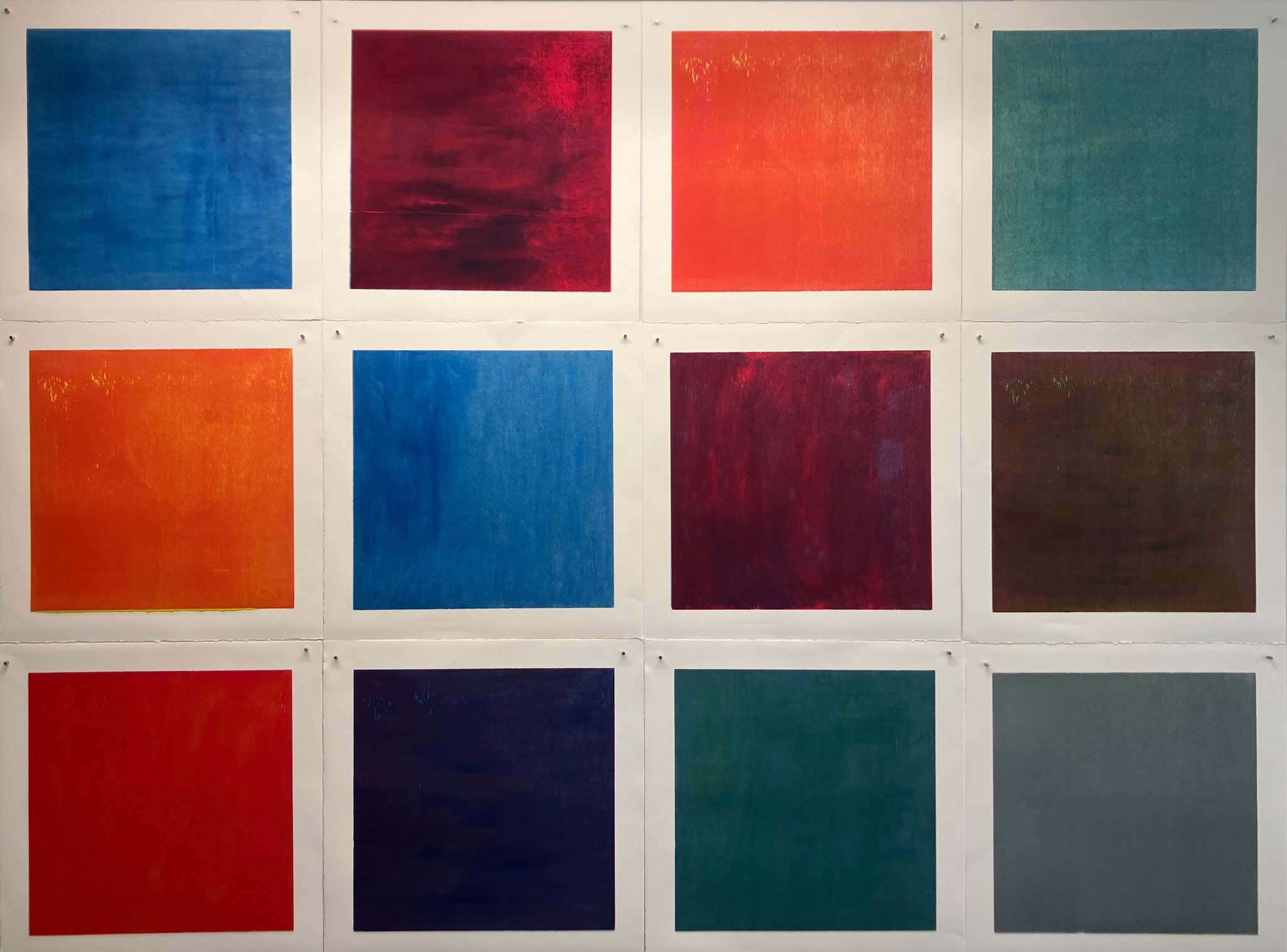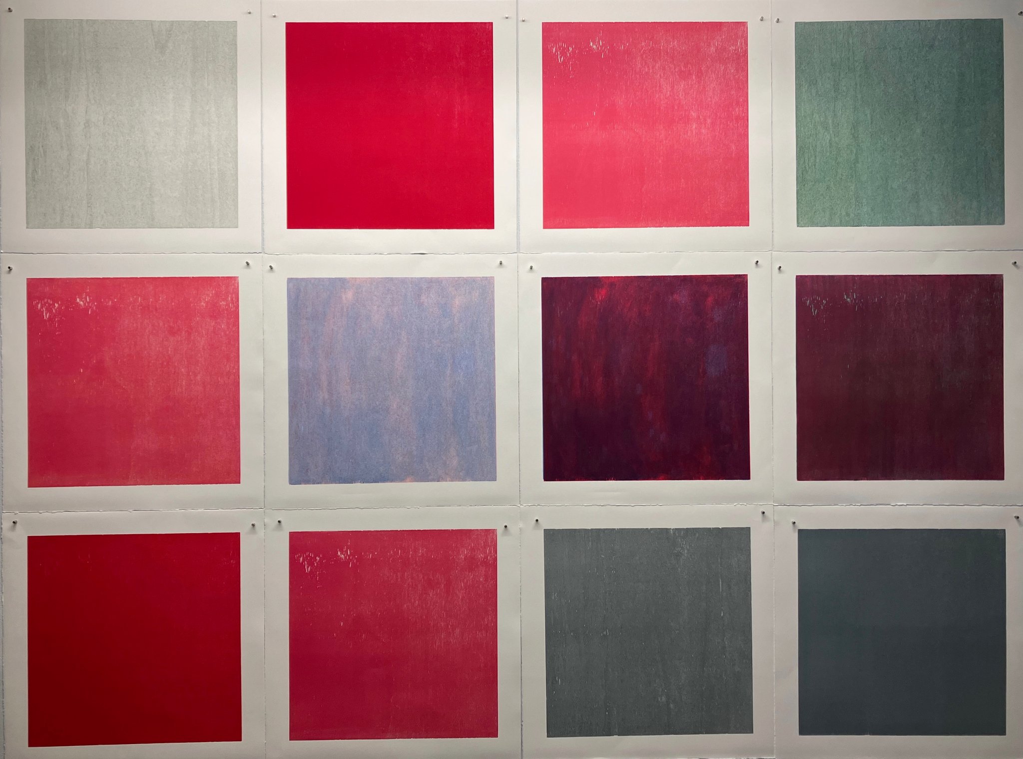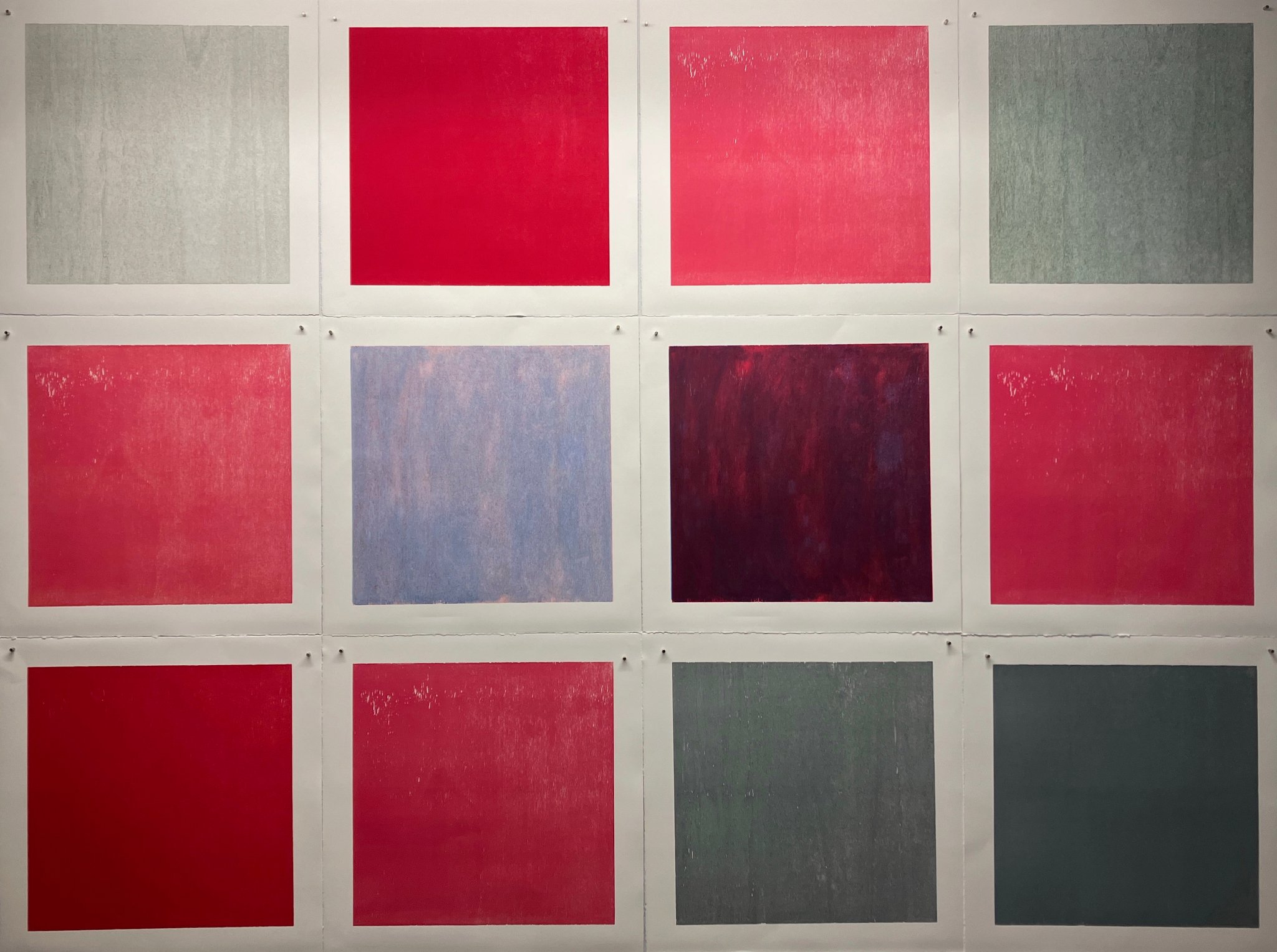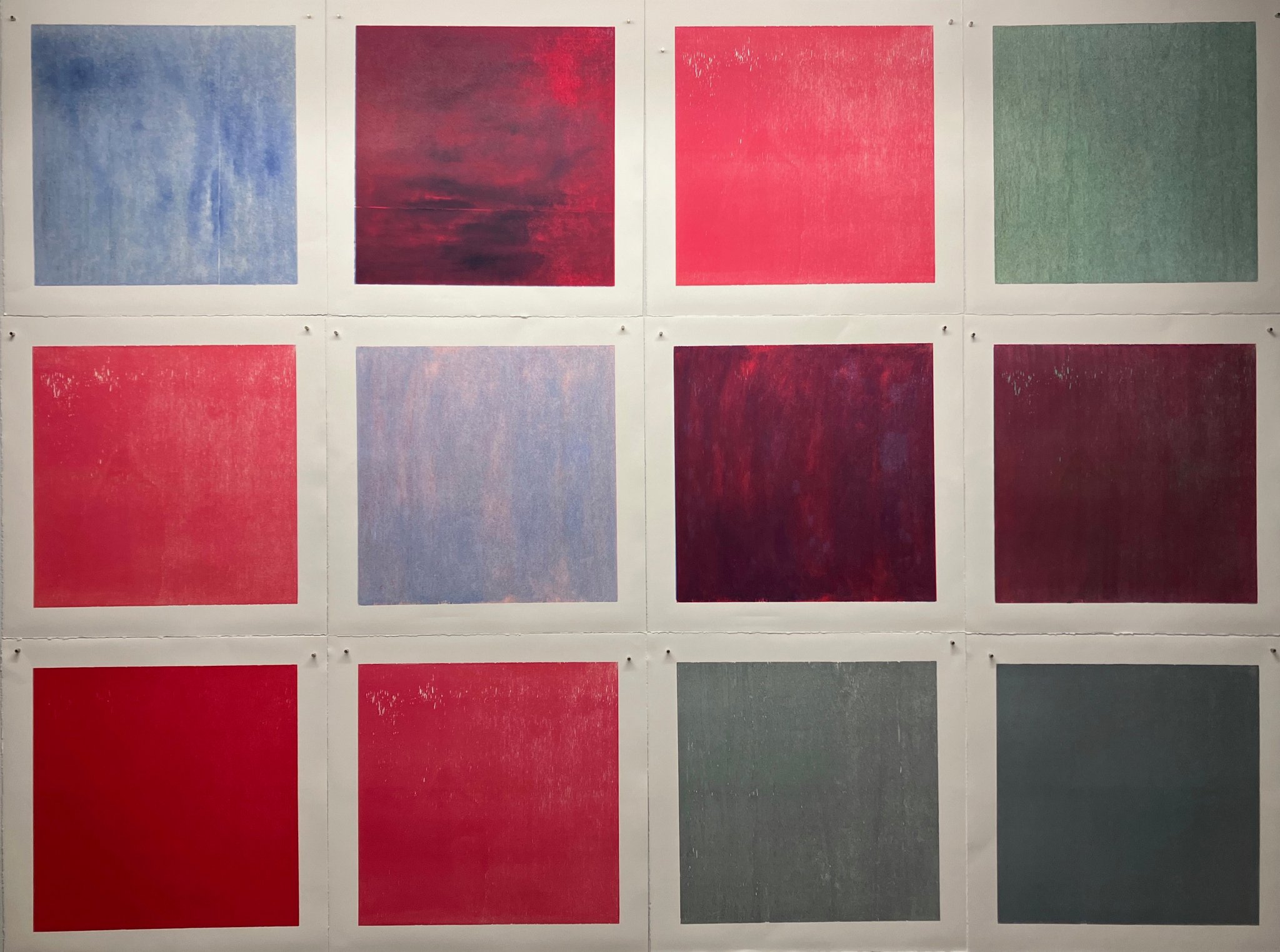 Originaldruckgrafiken, 12 Einzelblätter, handgedruckt auf Büttenpapier, 24 Druckstöcke, mehrfarbig, auf Leinwand aufgezogen, 160 x 120 cm, Unikate