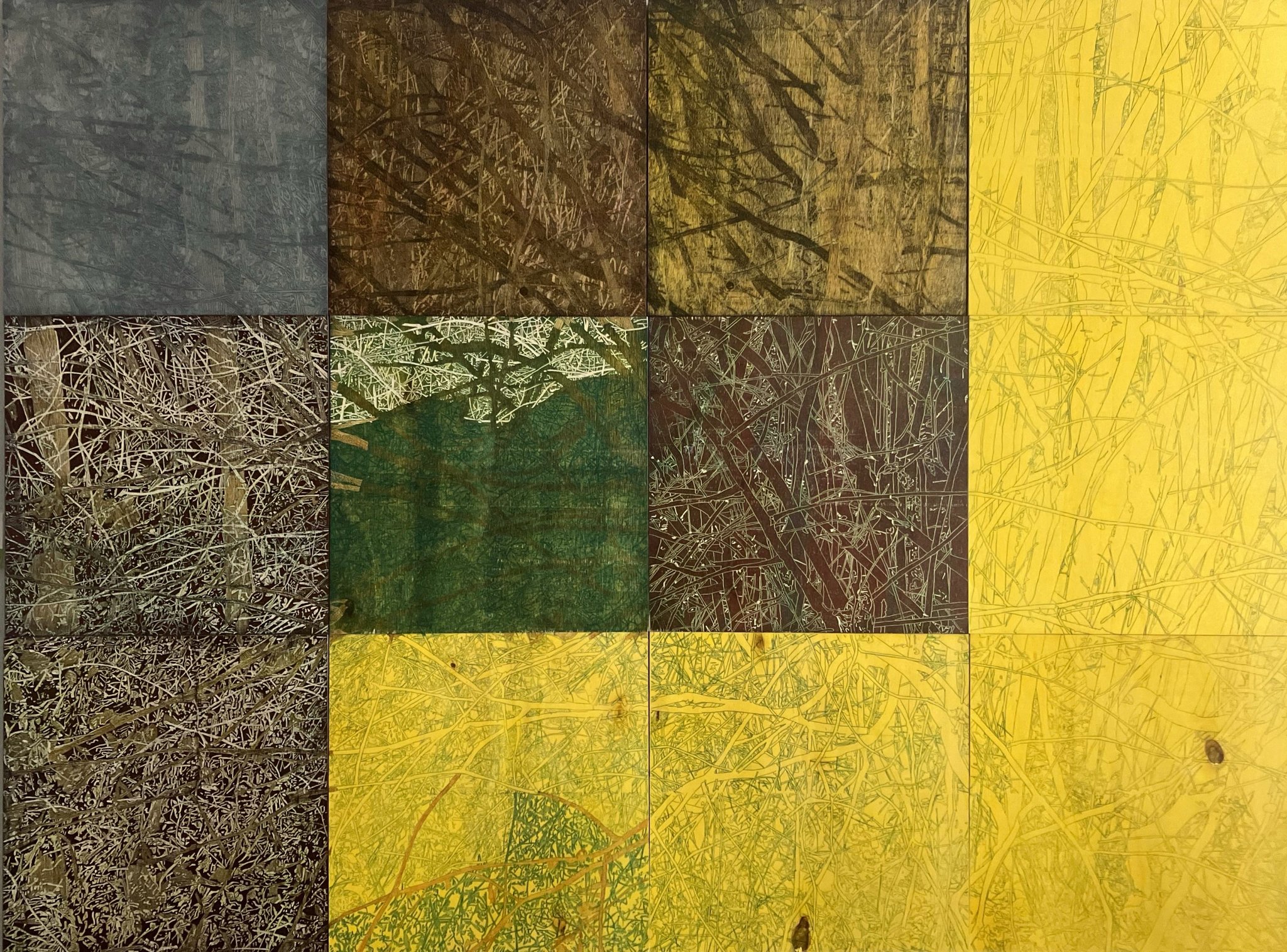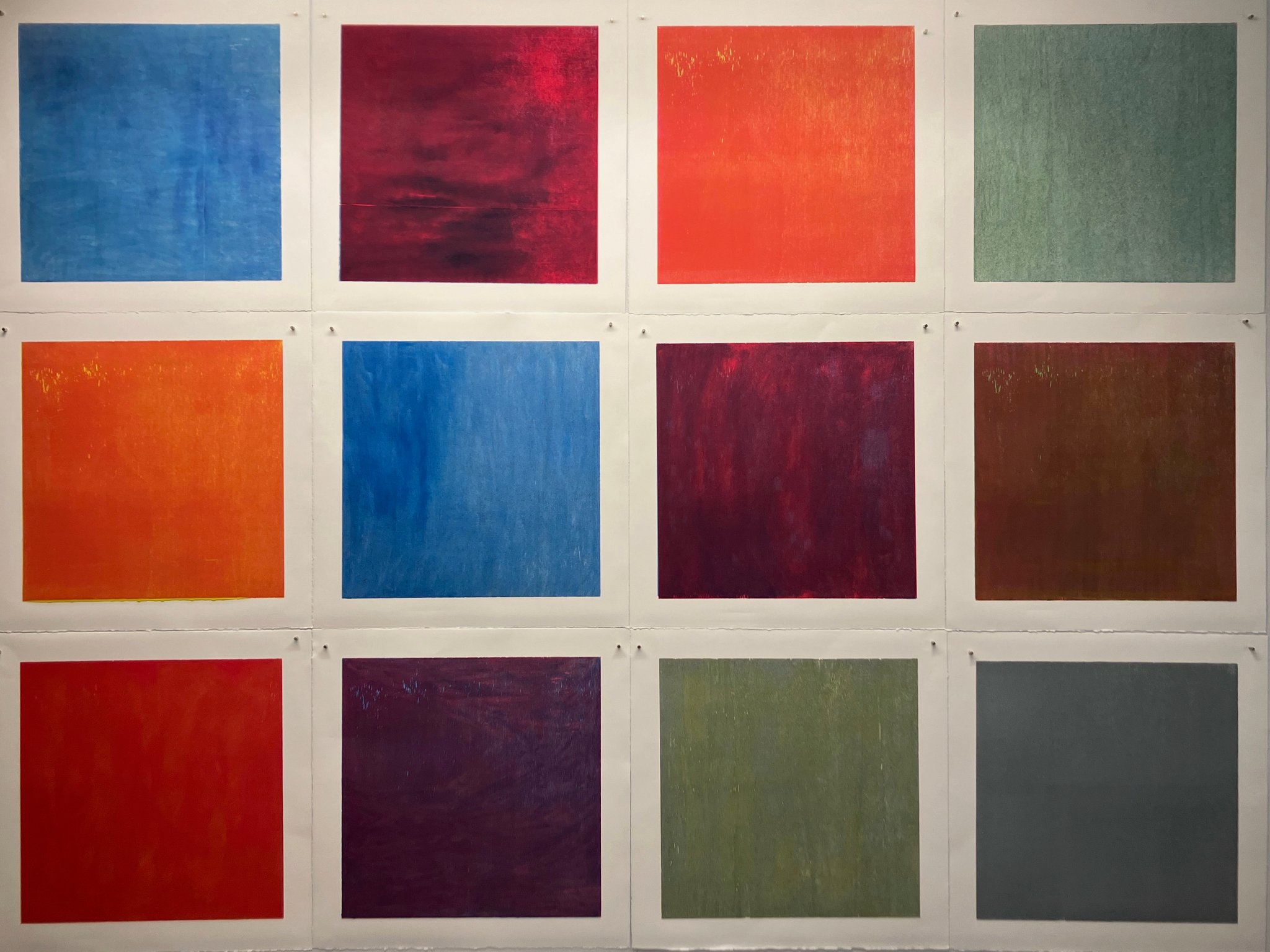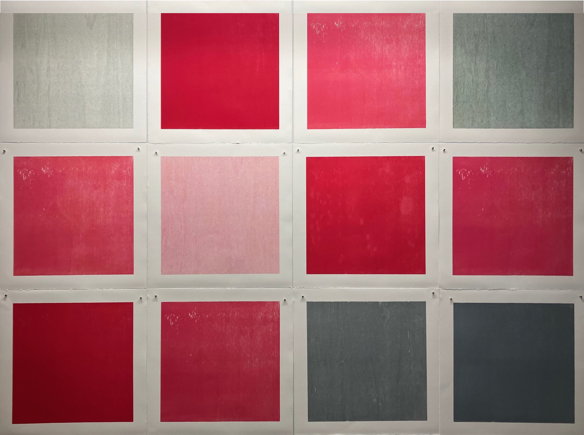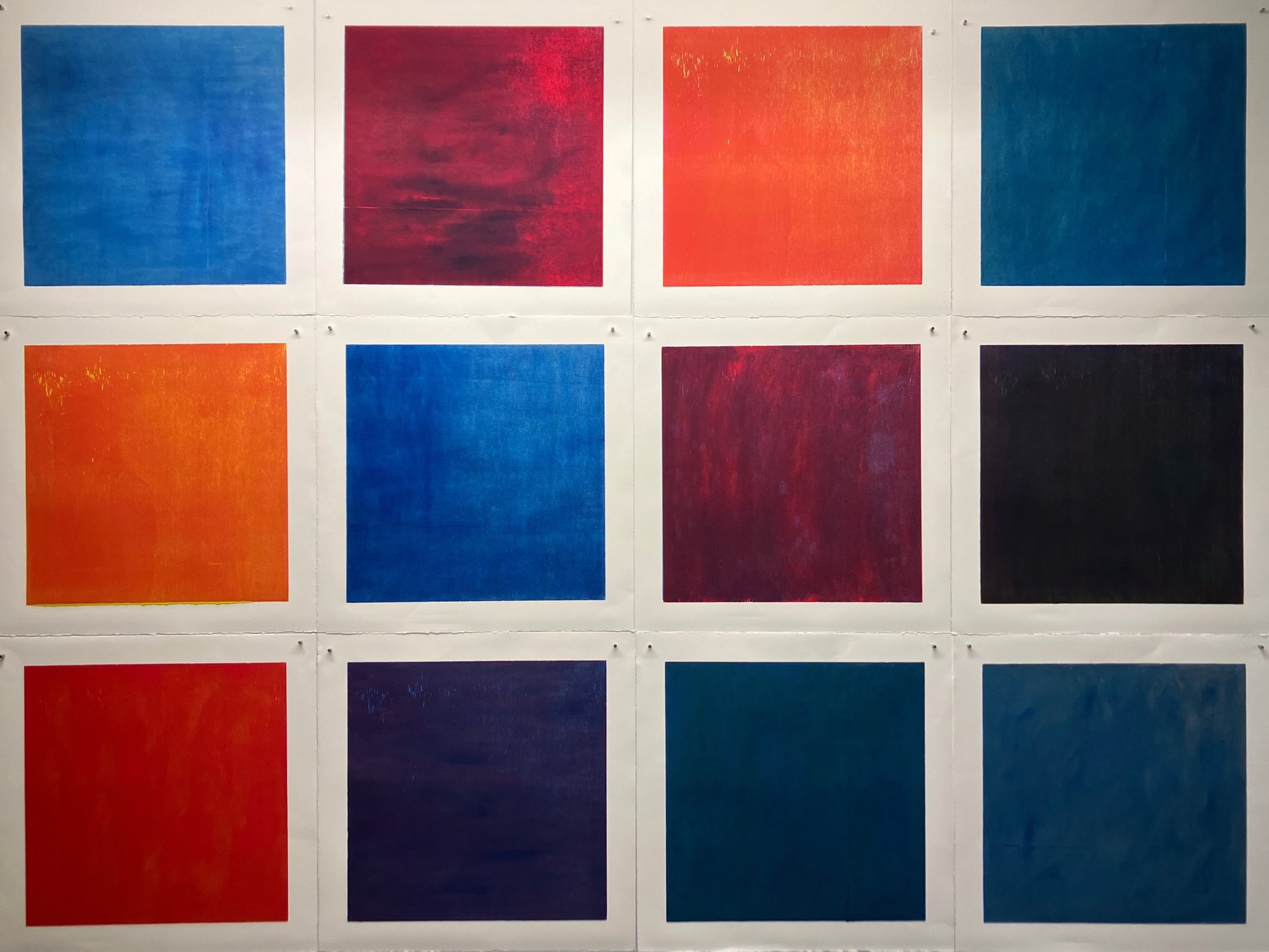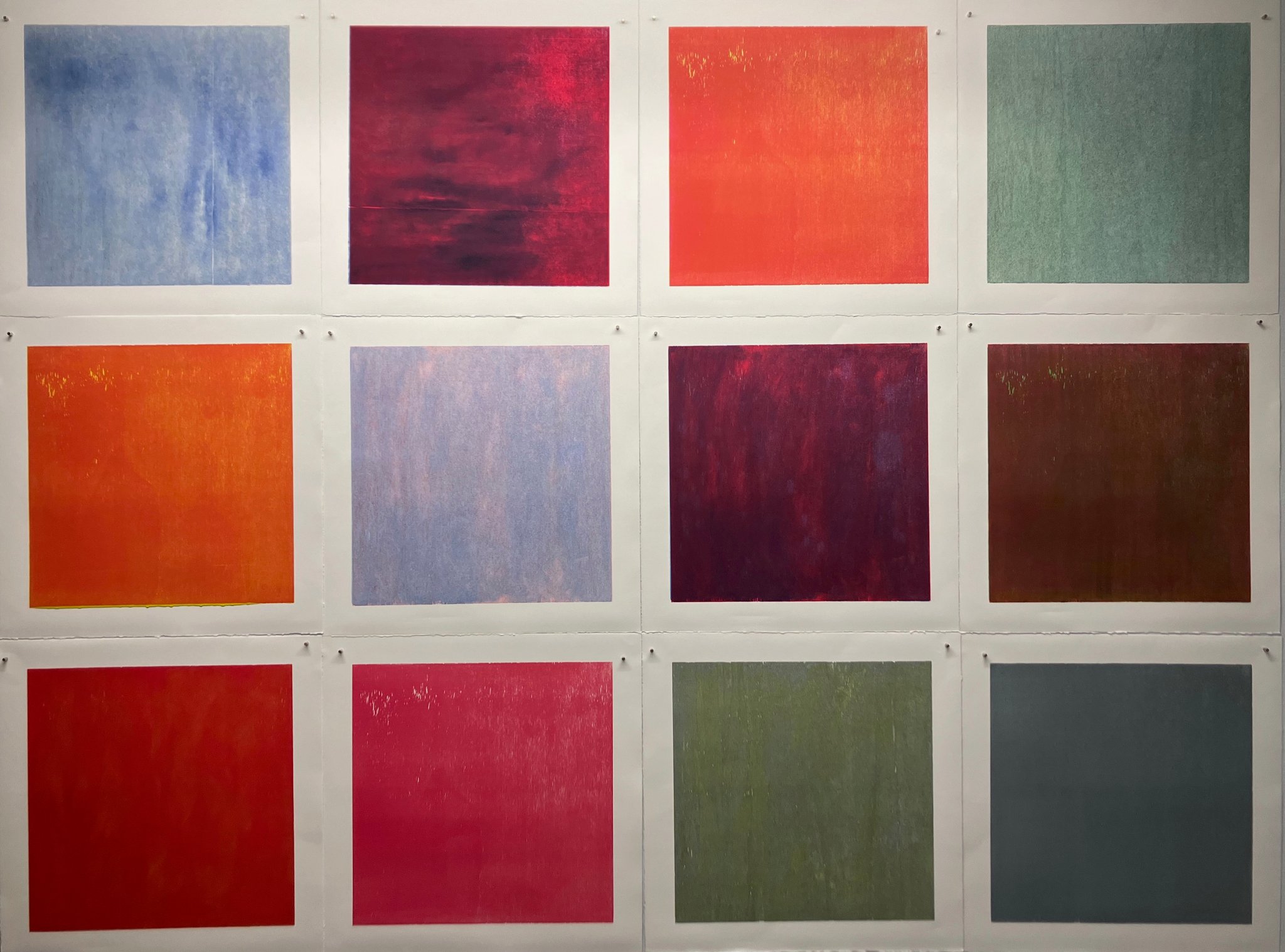Originaldruckgrafiken, 12 Einzelblätter, handgedruckt auf Büttenpapier, 24 Druckstöcke, mehrfarbig, auf Leinwand aufgezogen, 160 x 120 cm, Unikate