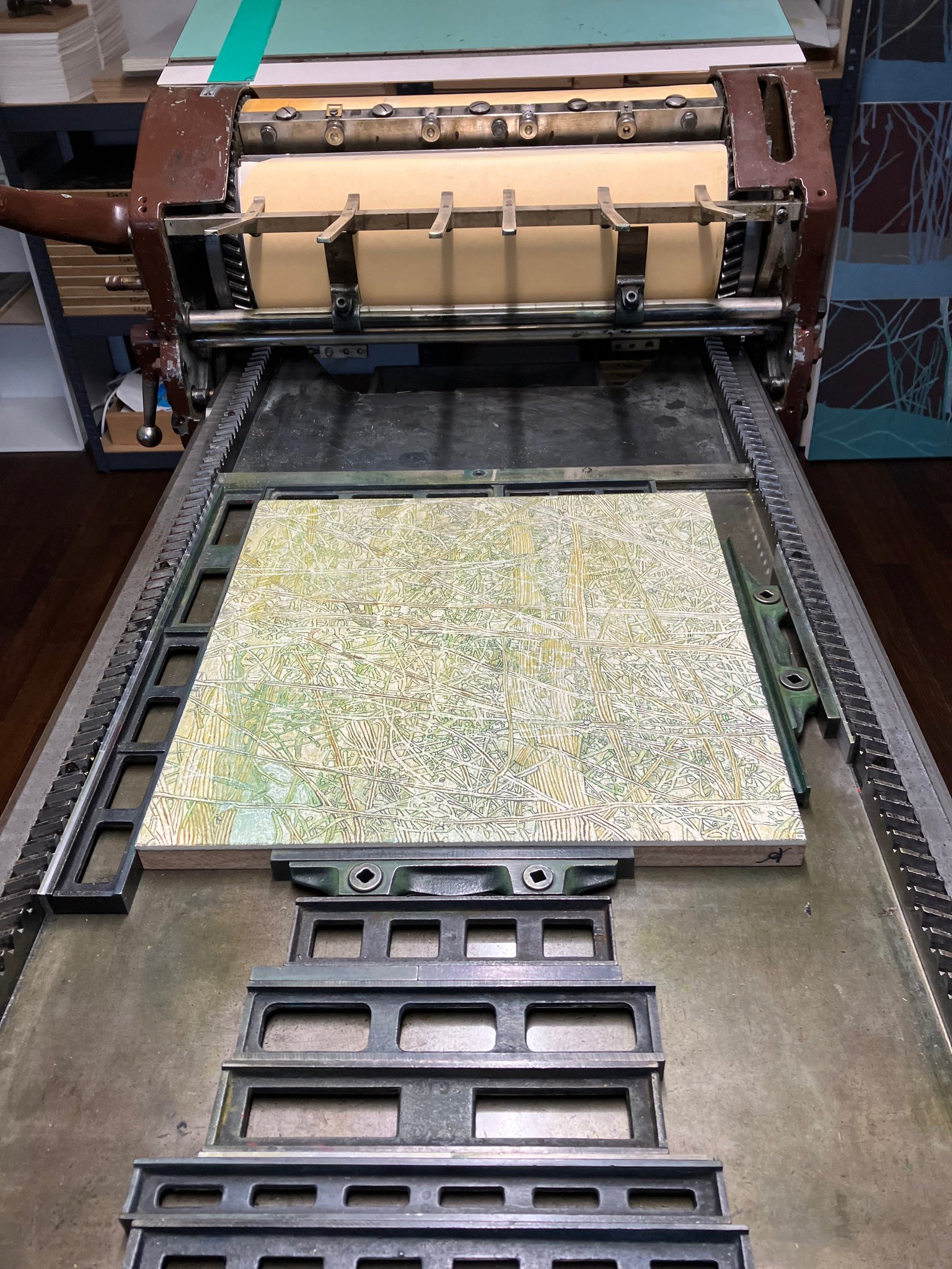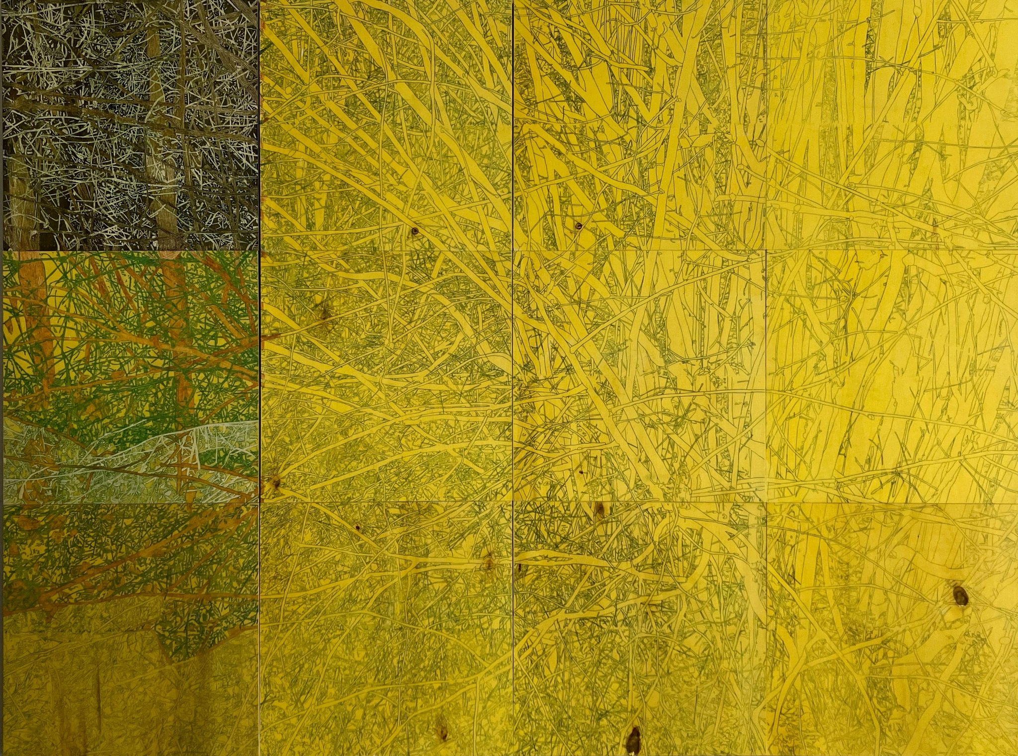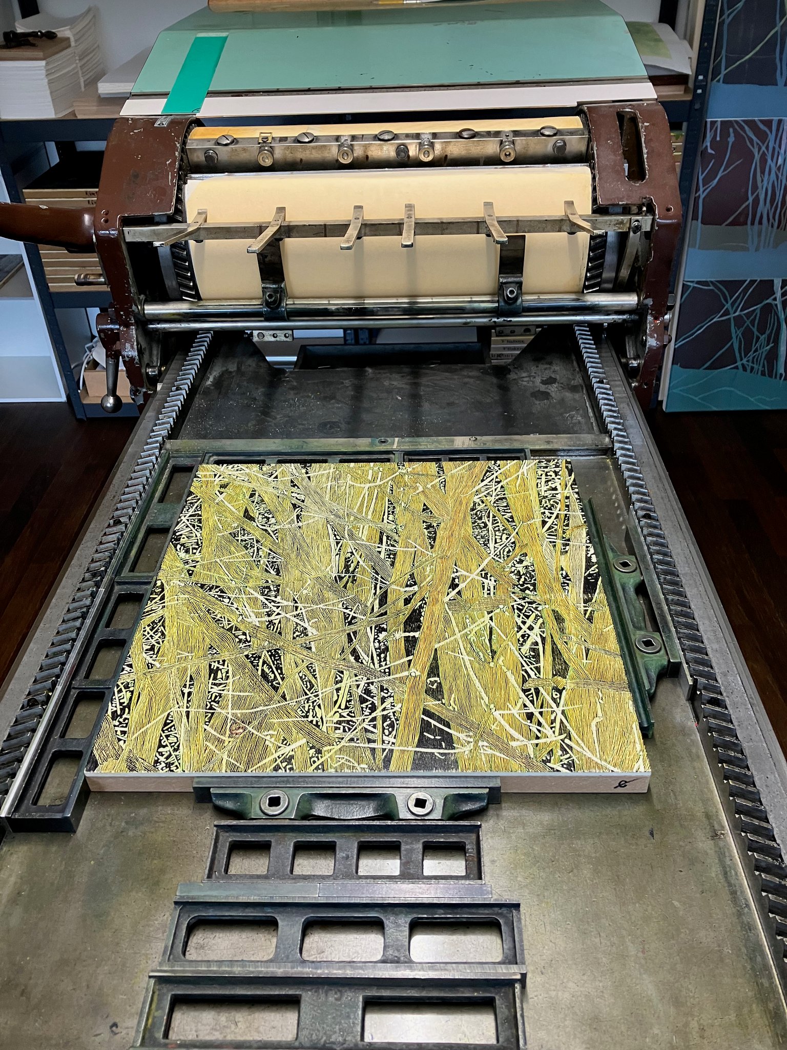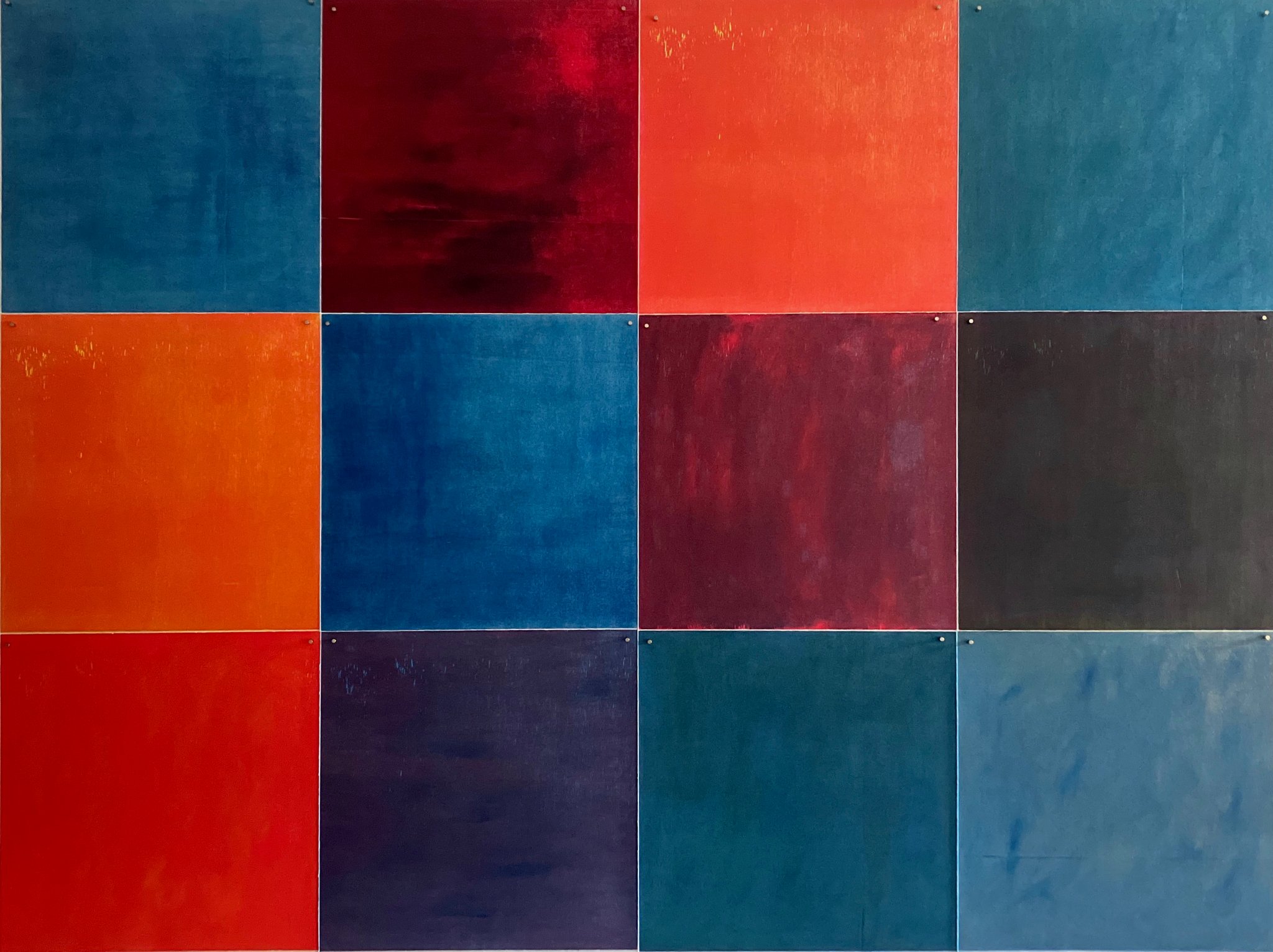 Originaldruckgrafiken, 12 Einzelblätter, handgedruckt auf Büttenpapier, 24 Druckstöcke, mehrfarbig, auf Leinwand aufgezogen, 160 x 120 cm, Unikate
