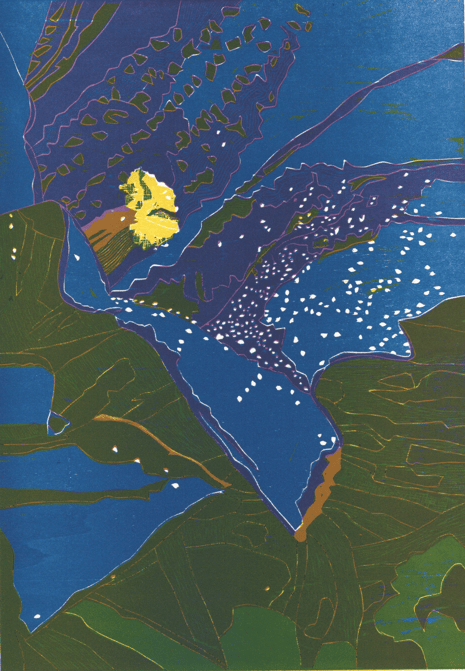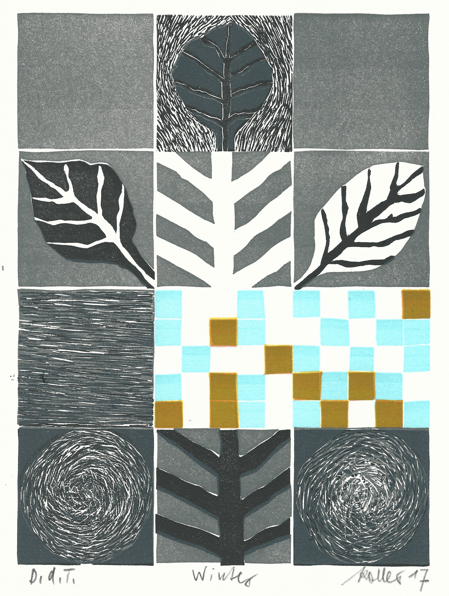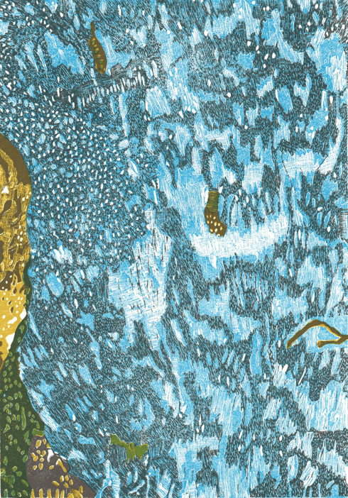 Original-Linolschnitt, 4 Farben (blau inverse)