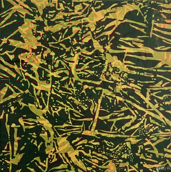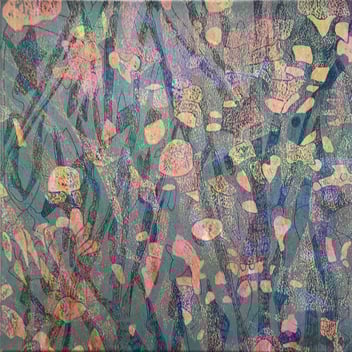 Holzschnitt, Druckplatten 40 x 40 cm aus Blumenwiese II, handgedruckt auf einer KORREX-Andruckpresse, auf reines Büttenpapier (BFK Rives), handgerissen, auf Leinwand aufgezogen (40 x 40 cm), signiert, Unikat