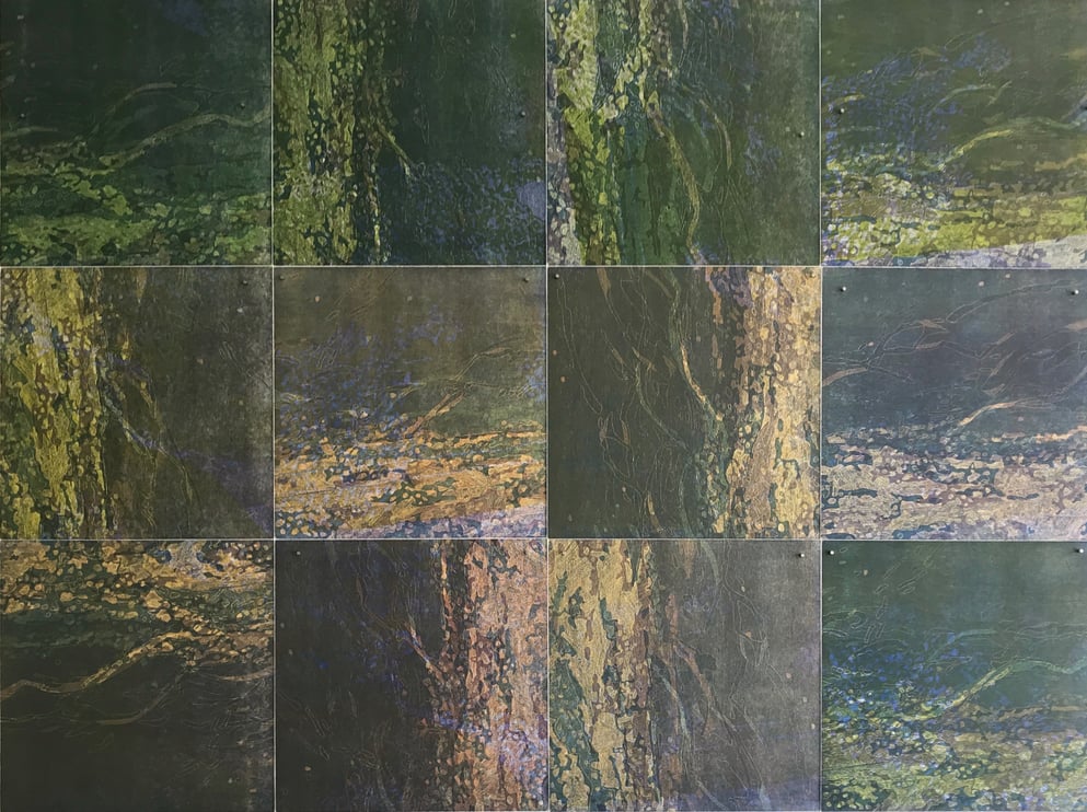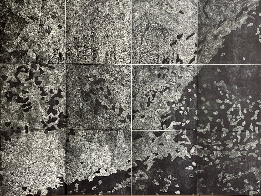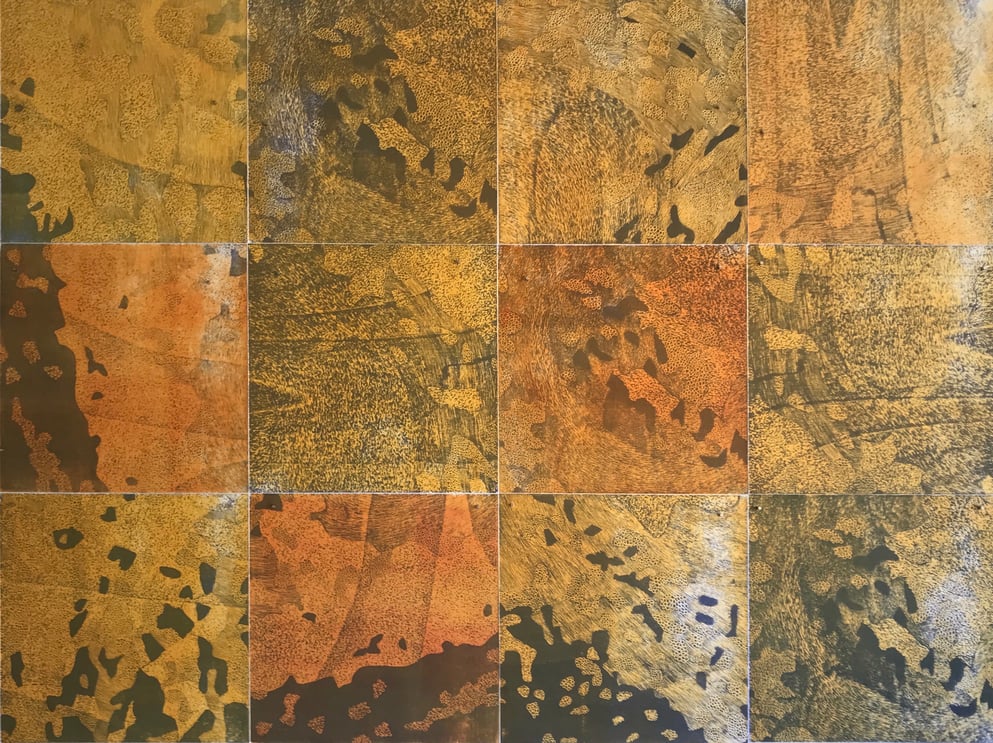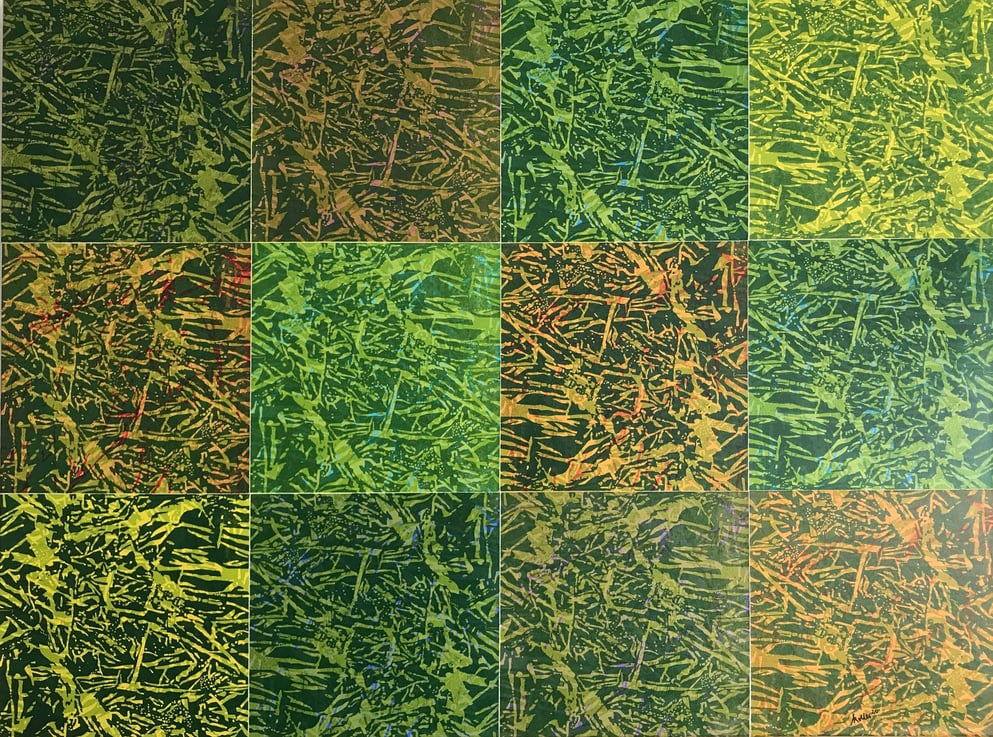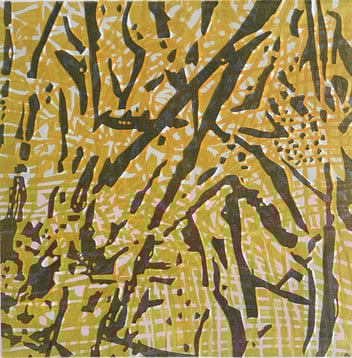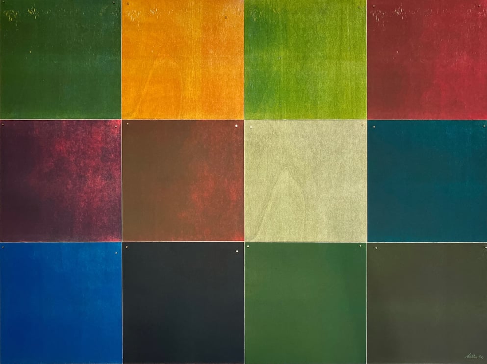 Linolschnitt, 12 Einzelblätter 40 x 40 cm, 3 Druckplatten, handgedruckt auf einer KORREX-Andruckpresse, auf reines Büttenpapier (BFK Rives), handgerissen, auf Leinwand aufgezogen (160 x 120 cm), signiert, Unikat
