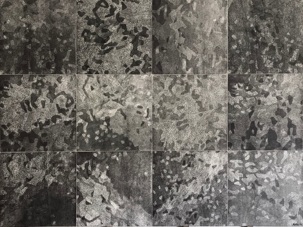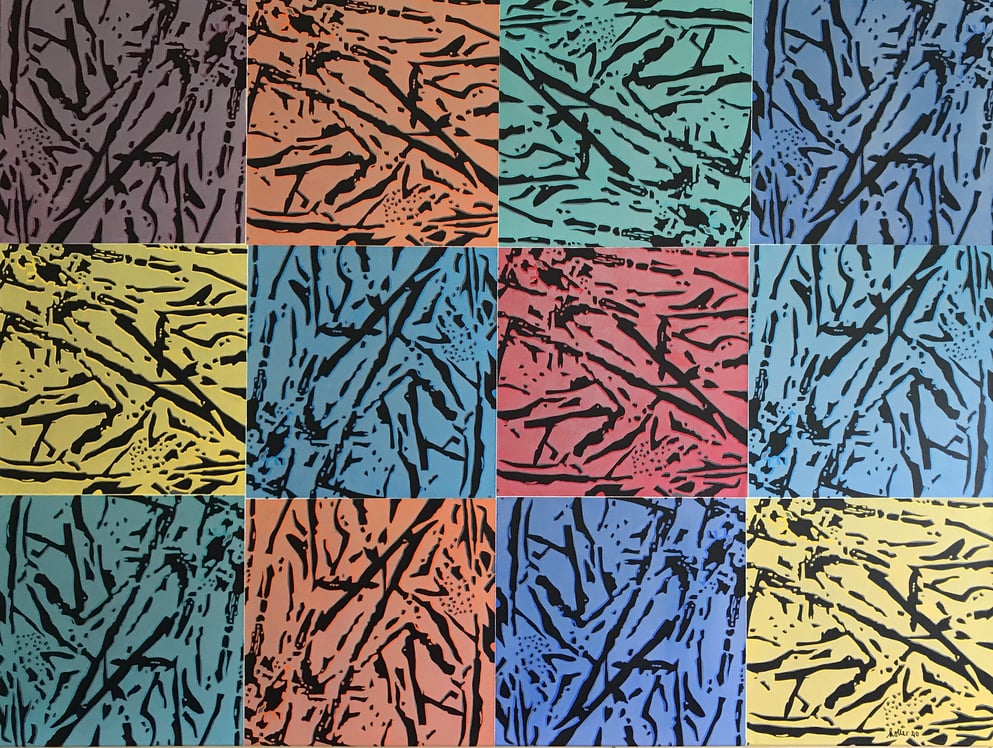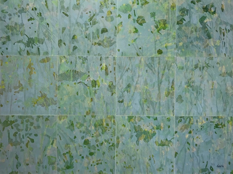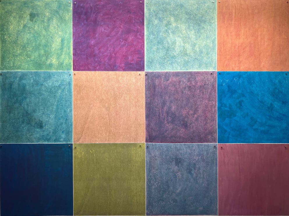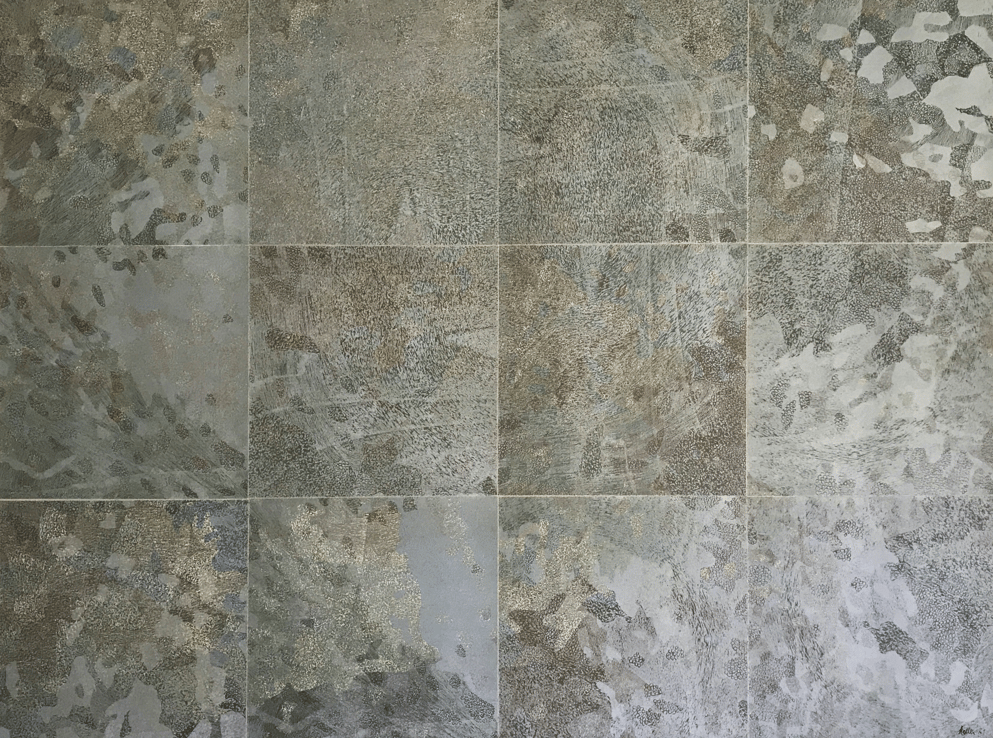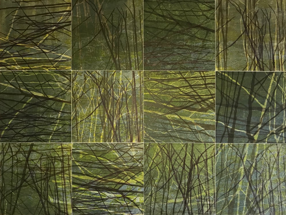 Linolschnitt, 12 Einzelblätter 40 x 40 cm, 3 Druckplatten, handgedruckt auf einer KORREX-Andruckpresse, auf reines Büttenpapier (BFK Rives), handgerissen, auf Leinwand aufgezogen (160 x 120 cm), signiert, Unikat