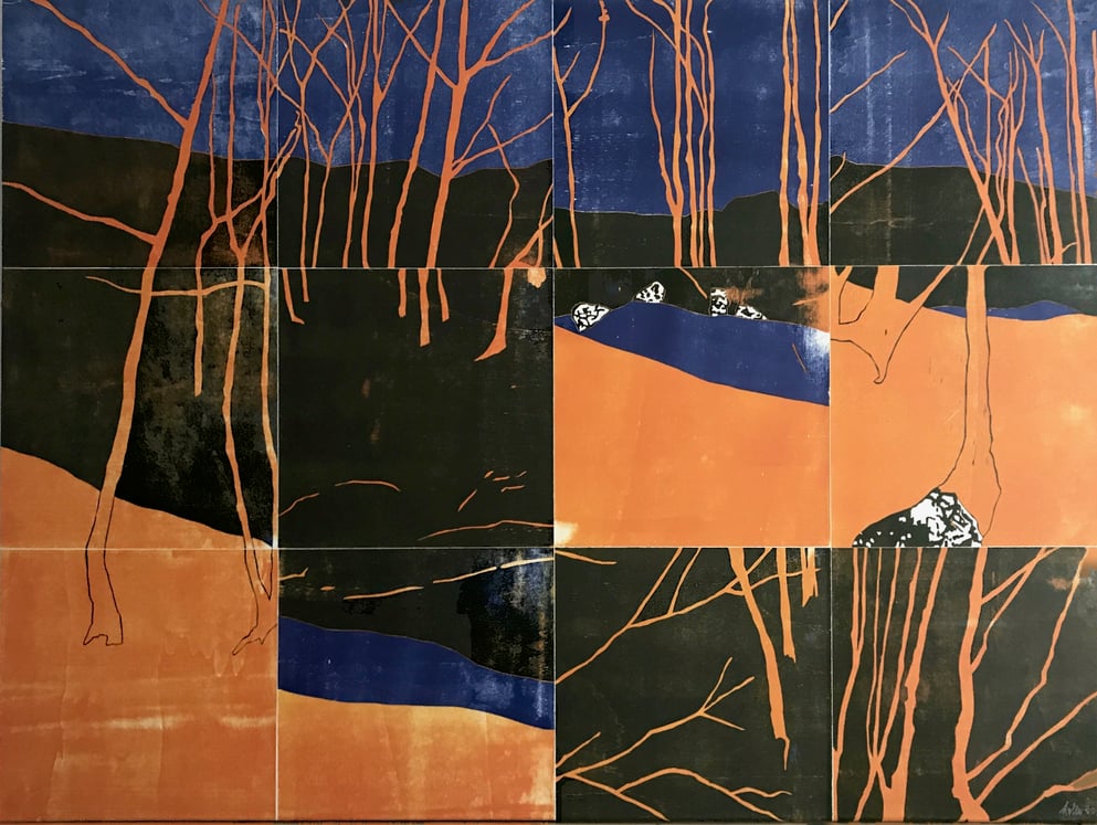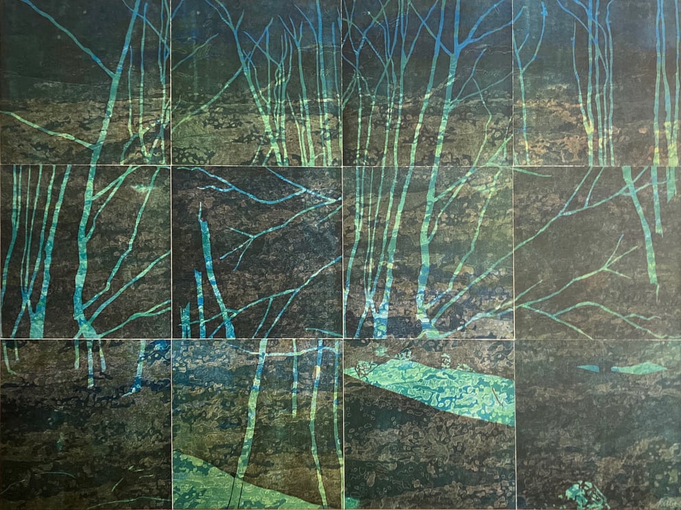 Holzschnitt, 12 Einzelblätter 40 x 40 cm, 3-4 Druckplatten, handgedruckt auf einer KORREX-Andruckpresse, auf reines Büttenpapier (BFK Rives), handgerissen, auf Leinwand aufgezogen (160 x 120 cm), signiert, Unikat