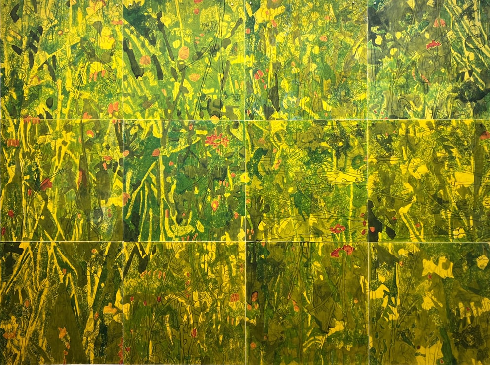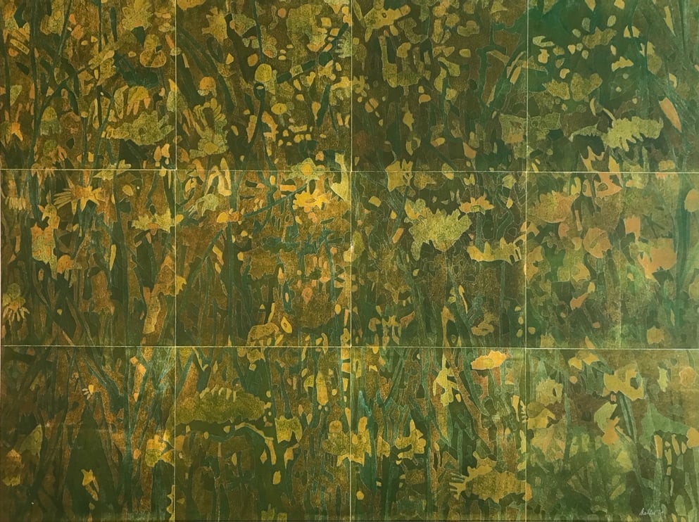 Holzschnitt, verschiedene Druckplatten Blumenwiese II 40 x 40 cm, handgedruckt auf einer KORREX-Andruckpresse, auf reines Büttenpapier (BFK Rives), handgerissen, auf Leinwand aufgezogen (160 x 120 cm), signiert, Unikat