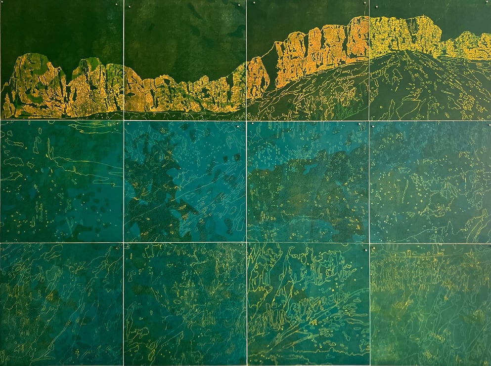 Holzschnitt, verschiedene Druckplatten Schrattenfluh Nord 40 x 40 cm, handgedruckt auf einer KORREX-Andruckpresse,